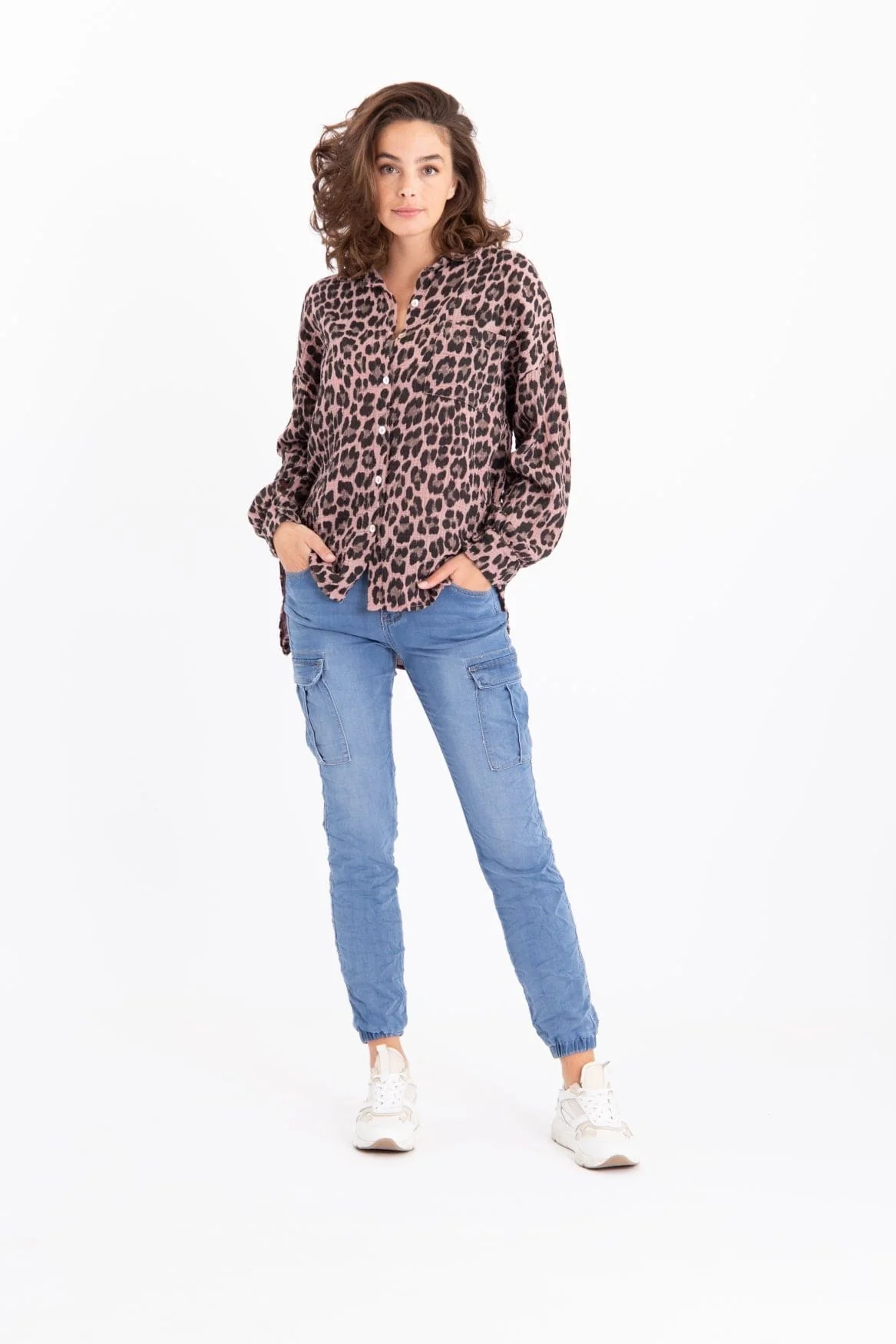 Vrouwelijke blouse gemaakt van zacht wafeltjes katoen. Speelse mouwen, mooie panter print en achter fijn iets langer. Valt lekker loose, draagt dus ook bij warm weer heerlijk luchtig.