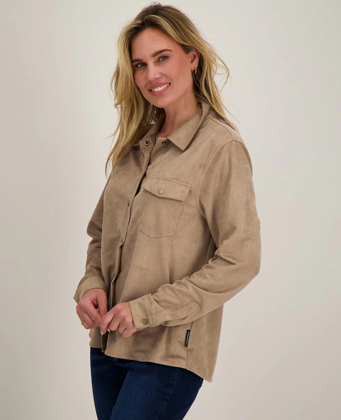 • Manchetten met sierknoopjes • Borstzakje • Comfortabele loose pasvorm • Mooie Suede look